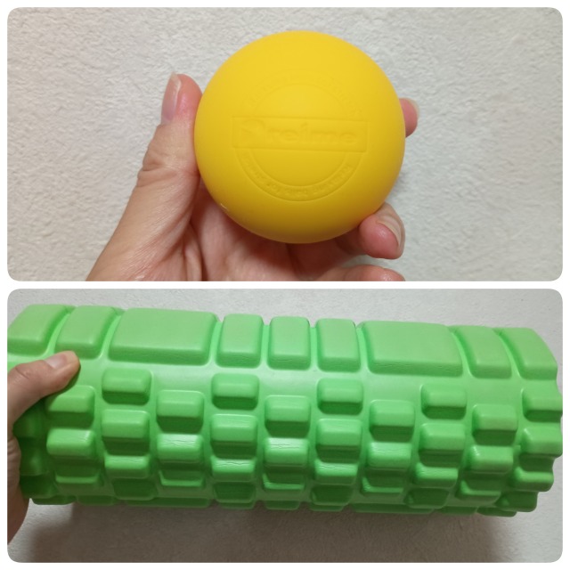 上半分は楽天市場で買った筋膜リリースボール、下半分はこちらも楽天市場でずいぶん前に買っていたローラー。
