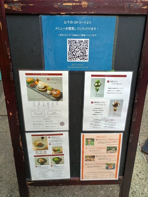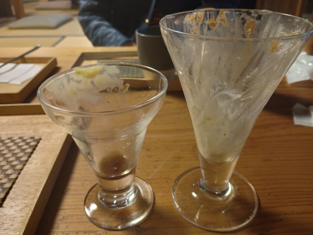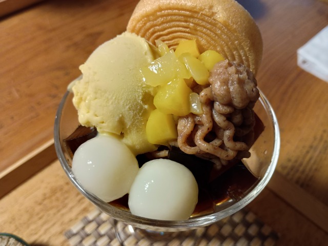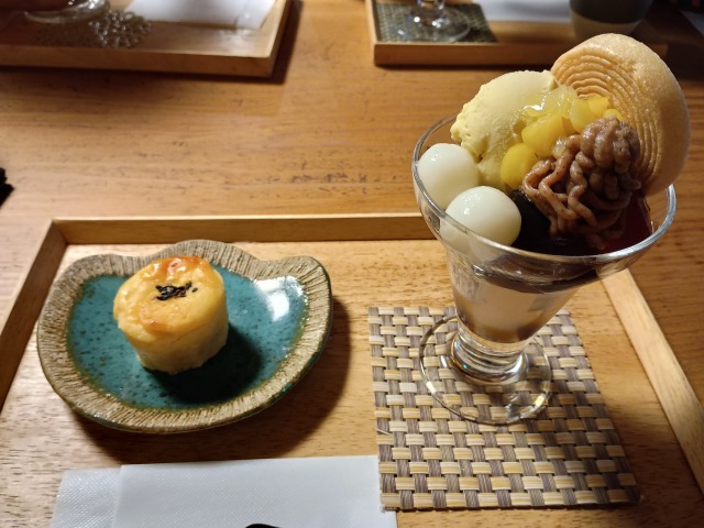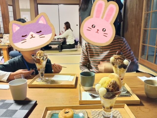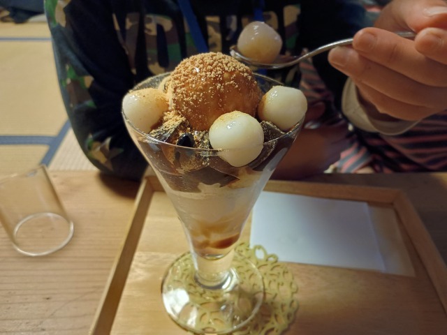 みやけ旧鴻池邸表屋で、私は季節限定のミニパフェセット、妹はマロンパフェ、下の甥っ子は黒蜜きなこパフェにしました。