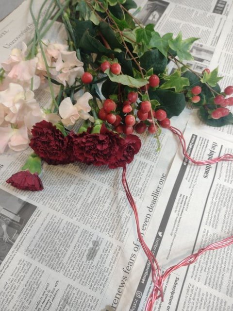 使用花材:①カーネーション、②ヒペリカム、③スイトピー、④アイビー、<その他>カラーワイヤー