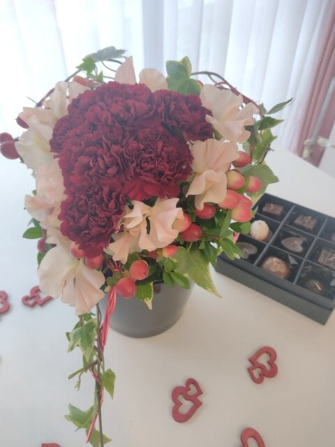 2025年2月のフラワーアレンジメントはバレンタインアレンジでした。