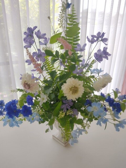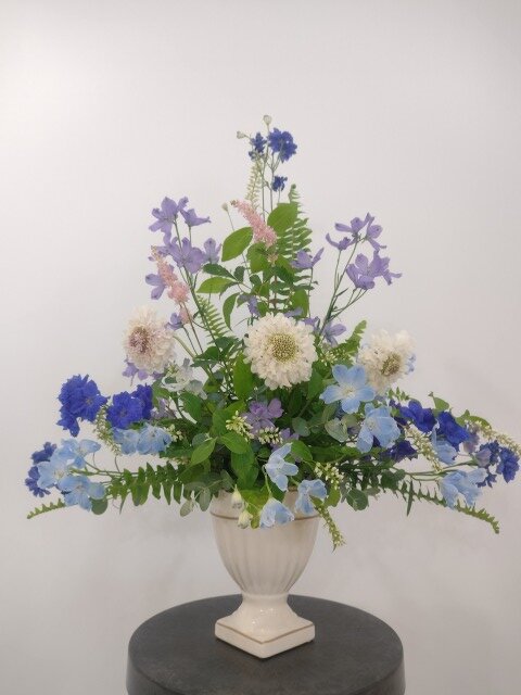 使用花材:①デルフィニウム(濃淡の違う3種類)、②アスチルベ、③スカビオサ、④タマシダ、⑤姫リョウブ