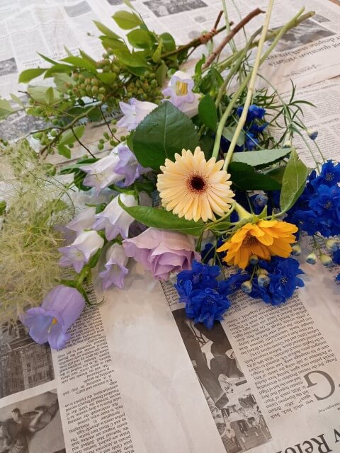 使用花材:①デルフィニウム、②ヒマワリ、③カンパニュラ、④バラ、⑤トルコキキョウ、⑥ガーベラ、⑦ブルーベリー