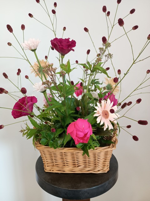 2024年11月のフラワーアレンジメント体験教室では<誕生日祝いのバスケットアレンジ>を作りました。