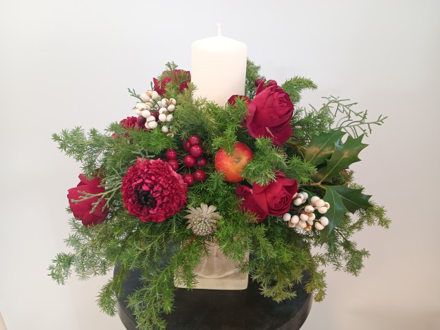 使用花材:①サツマスギ、②ラナンキュラス、③スプレーバラ、④ブルーアイス、⑤アストランチア・マイヨール、⑥ナンキンハゼ、⑦姫りんご、⑧マツカサ・ナチュラル、⑨ヒイラギ、⑩サンキライ(実5個分)<その他>ホワイトキャンドル