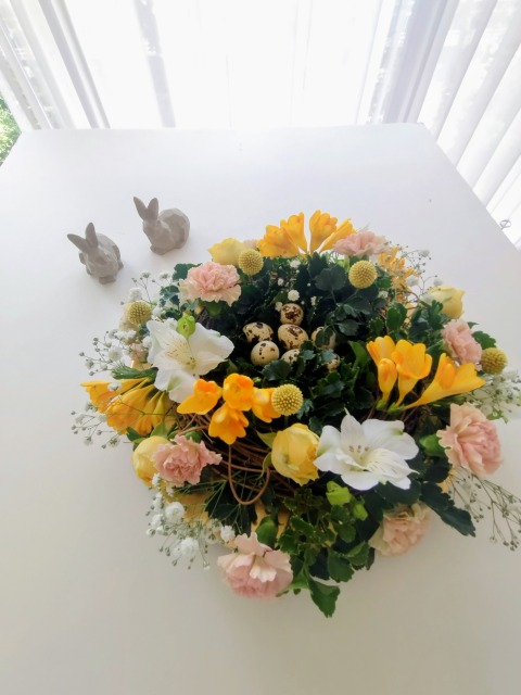 ウサギの置物やうずらの卵で、イースターらしいフラワーアレンジになりました。